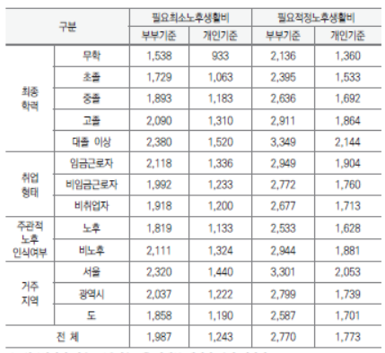 2021년도 국민노후보장패널조사(KRelS) 기초분석보고서에 따르면 필요적정노후 생활비는 거주지역과 학력에 따라 차이가 있지만 부부 기준으로 1달에 214만 원에서 335만 원의 비용이 필요하다고 인식하고 있다.